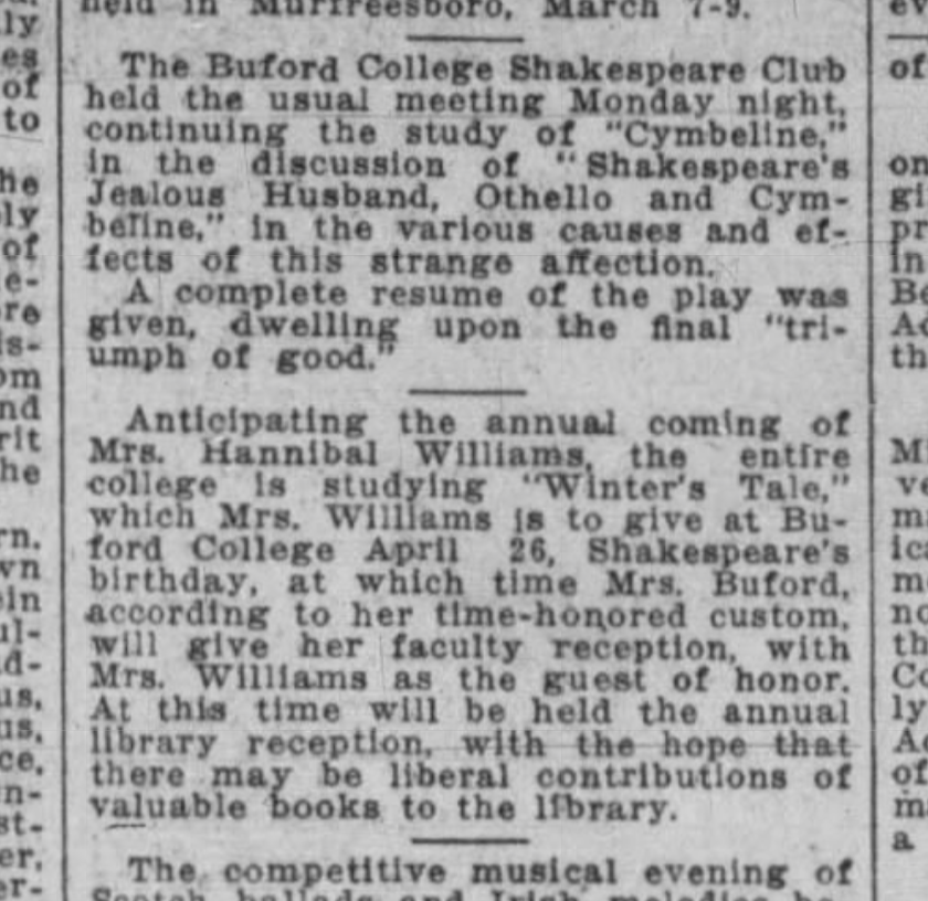 One specific type of club during this time was the women's Shakespeare Club—in the early 1900s, there was a club in almost every major city in the US. In these clubs, women debated issues such as the “authorship question” and helped members pursue educational and intellectual advancement. The largest club, made up of 100 members across the U.S., was the National Shakespeare Federation. Elizabeth Burgess Buford, founder of the Buford College for Women in Nashville, was a member of the National Shakespeare Federation and ran her own faculty Shakespeare club. Read through the newspaper announcement above to hear about the debates they had.