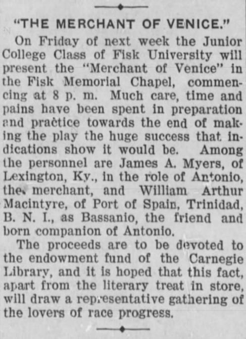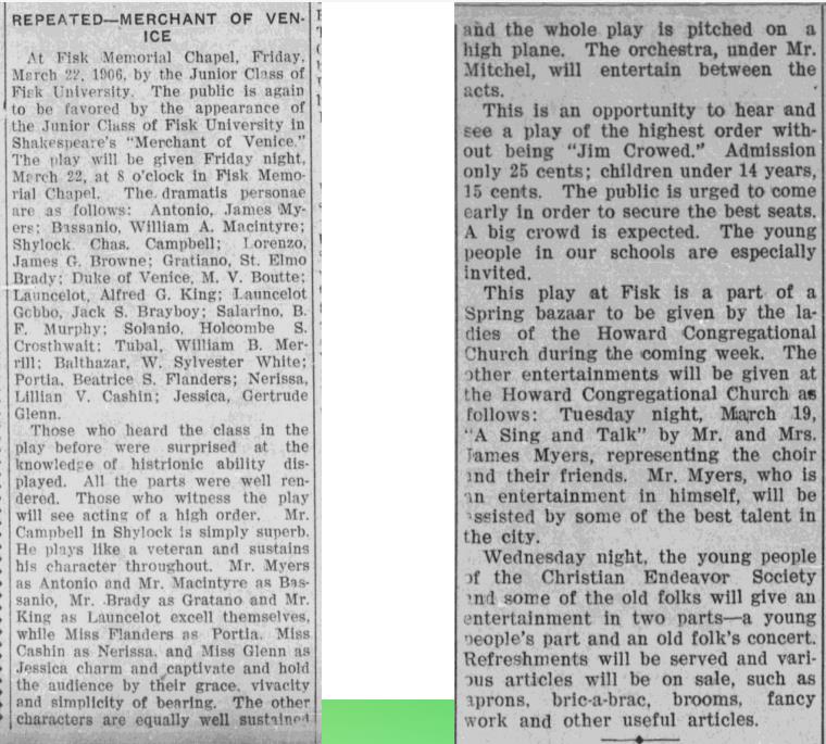 Fisk University’s production of The Merchant of Venice took place at the Memorial Chapel in 1907. Read the announcement for the production on the right. How do you think this show participated in the advancement of Black art and culture in Nashville?