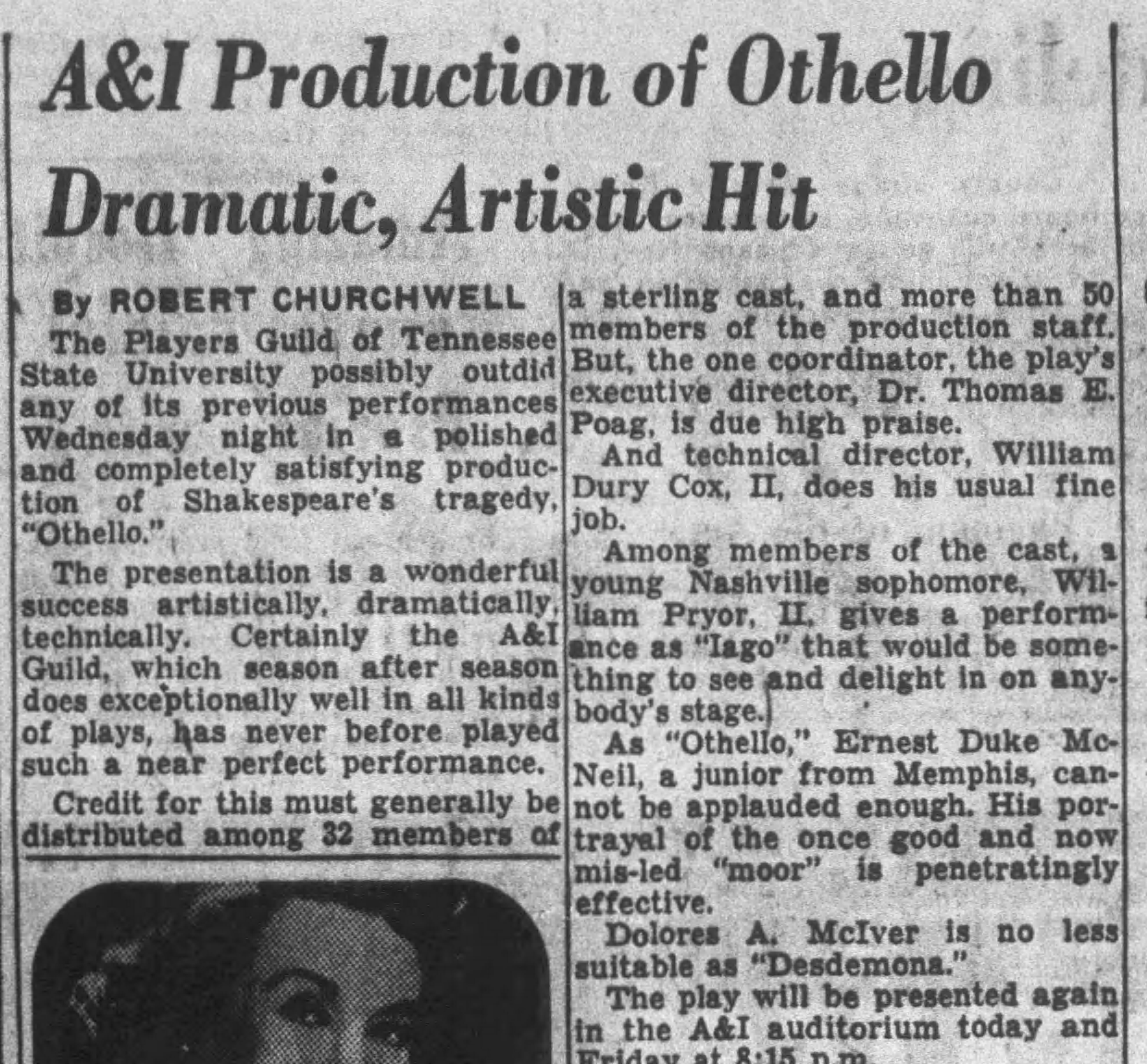 Churchwell’s review of Othello mentions the director, Dr. Thomas E. Poag. According to Tennessee State University, Dr.Poag was “the first African-American in history to receive M.A. and Ph.D. Degrees in drama and theatre.” Dr.Poag, an actor, playwright, and professor, established TSU’s theater company and wrote three plays during his lifetime. Oprah Winfrey was one of his students.